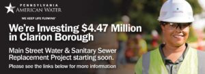 Pennsylvania American Water – Clarion Borough Main Street Water and Sanitary Sewer Main Replacement Project to start soon! Please see the following links for more information: