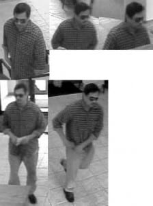 Male, white, mid-30’s, 5?8?? – 5?10??, average build, dark hair, mustache, unshaven, sunglasses, blue/brown/tan flannel shirt, jeans, dark shoes.